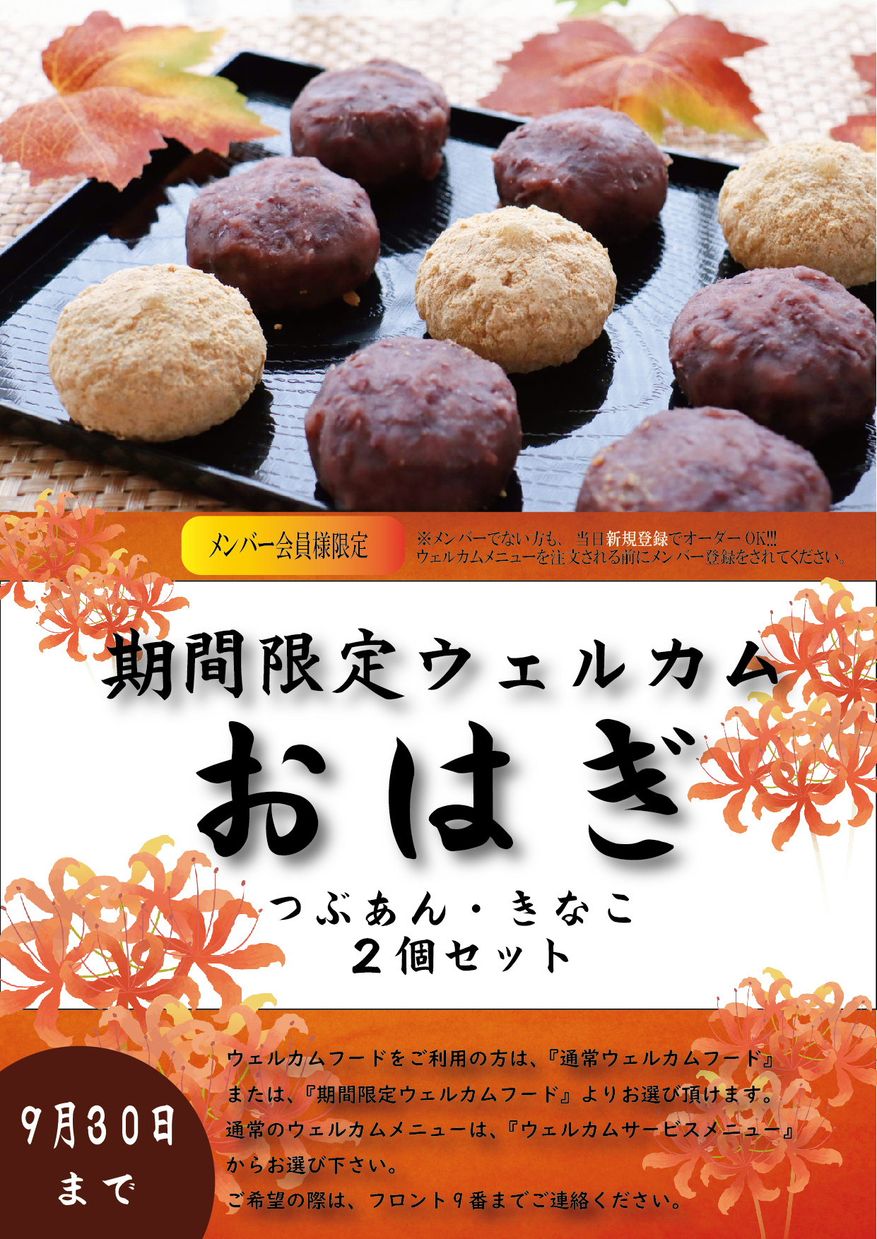 期間限定ウェルカムフード「おはぎ」登場! ◇◆------------◆◇ 期間限定🍁ウェルカム おはぎ ◇◆------------◆◇ 休憩や、宿泊でちょっと 一息つきたいそんなあなたに あま~いスイーツは いかがですか? 期間限定ウェルカムメニュー おはぎが登場!🥰 あんこの甘い口溶けに 食欲がすすみます😍 他にも食べたいデザート しょっぱいものが食べたい時は グランドメニューをご覧ください💓 期間限定で本日から 9月30日までとなっておりますので ウェルカムメニューを選ぶ際は 是非ご賞味くださいませ😆 ※内容や商品番号は店舗によって異なる場合がございます。オーダーの際は、お部屋に設置されたカタログ・POP等でご確認の上、ご注文ください。 ニュース一覧へ