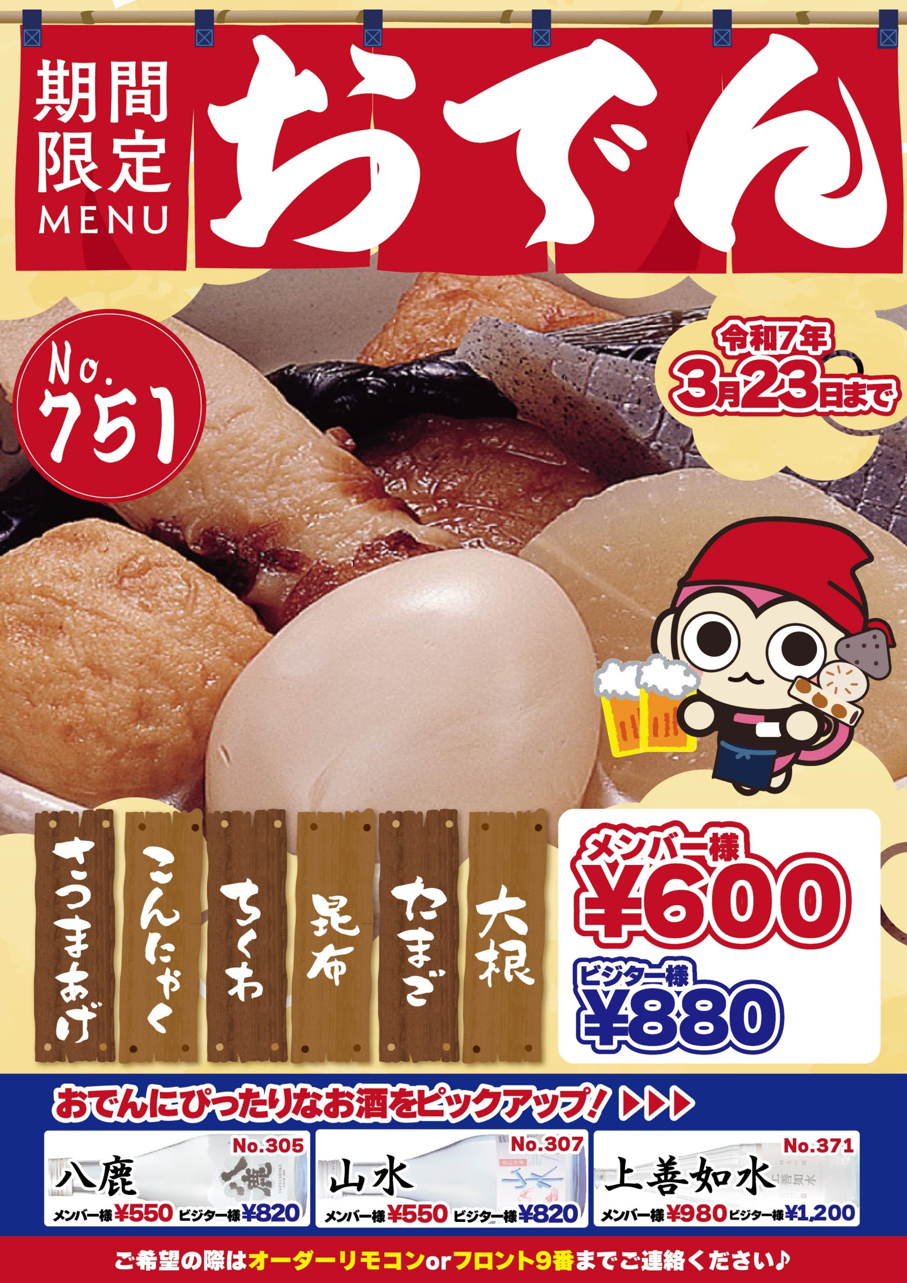 期間限定おでん販売開始! *★*――――*★* ――――*★*――――*★* 冬の定番!!毎年人気のメニュー 『おでん』販売開始 *★*――――*★* ――――*★*――――*★* 今年もやってきました!!! 寒い時期に食べたくなるおでん🍢 今年もだしが自慢の6種類 ・大根 ・玉子 ・結び昆布 ・焼きちくわ ・さつま揚げ ・こんにゃく の6種類6品セットで販売させていただきます🍲 こちらも期間限定販売となります。 おでんに合うお酒も種類豊富に揃っております🍶 ぜひ、ご賞味ください🤩 ※内容や商品番号は店舗によって異なる場合がございます。オーダーの際は、お部屋に設置されたカタログ・POP等でご確認の上、ご注文ください。 ニュース一覧へ
