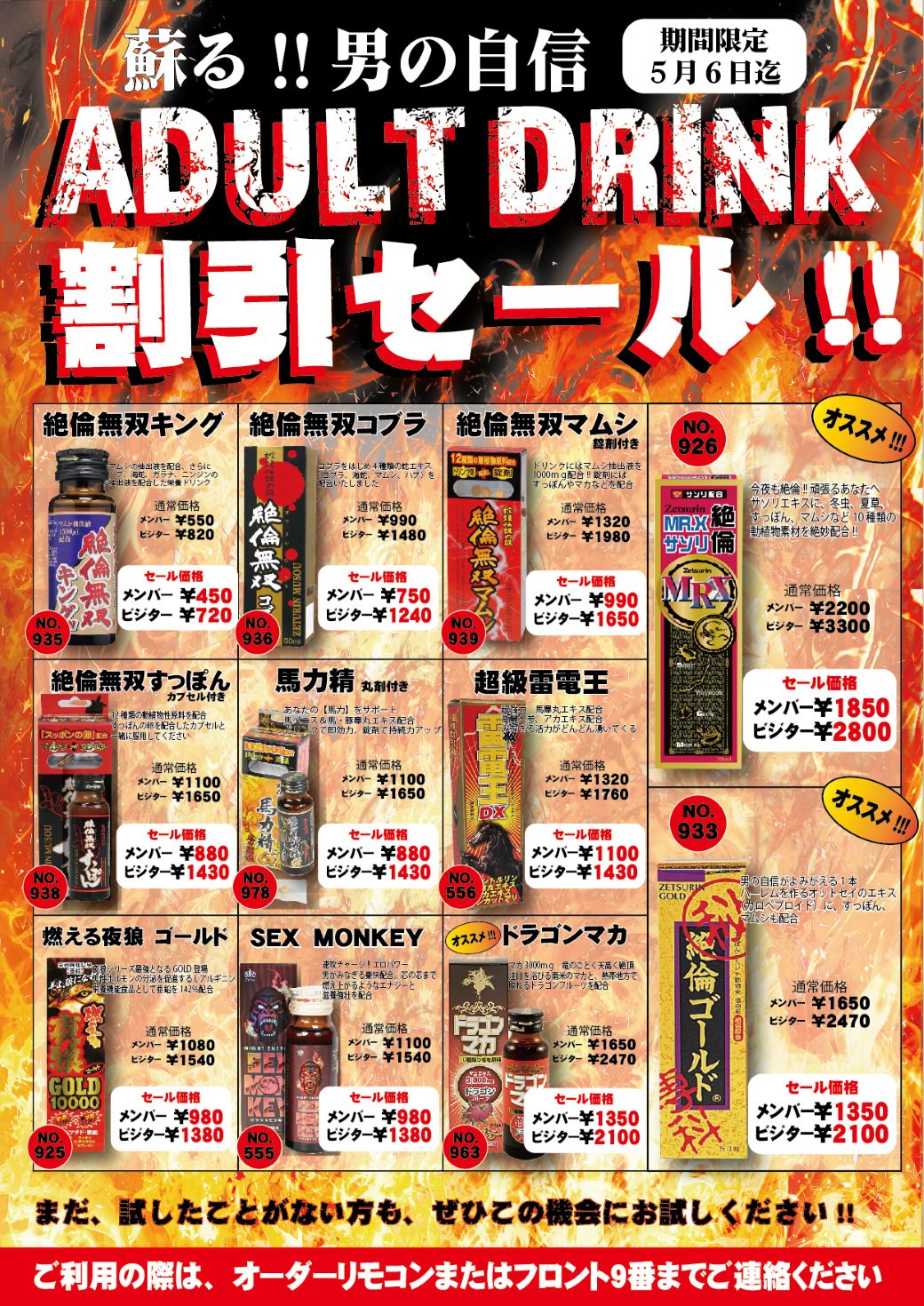 期間限定サプリ・ドリンク割引セール!!! ♥═━┈┈ ♡═━┈┈ ┈┈━═♡ ┈┈━═♥ アダルトドリンク★割引セール ♥═━┈┈ ♡═━┈┈ ┈┈━═♡ ┈┈━═♥ 蘇る!!!男の自信!!! 今だけ!!大人の魅力を引き出すドリンクが特別割引❤️❤️❤️ お気に入りの味があれば勿論、 まだ試したことのない方も、お得な価格で試せる チャンスです★☆ マムシのような圧倒的な存在感 サソリのように強い刺激 ごブラのような強力な味わい マカで活力アップ などなど、いろいろな種類を揃え いまだけの限定価格でご提供です🐍 5月6日迄となっておりますので ぜひ、この機会にお試しください💞💋 ※内容や商品番号は店舗によって異なる場合がございます。オーダーの際は、お部屋に設置されたカタログ・POP等でご確認の上、ご注文ください。 ニュース一覧へ
