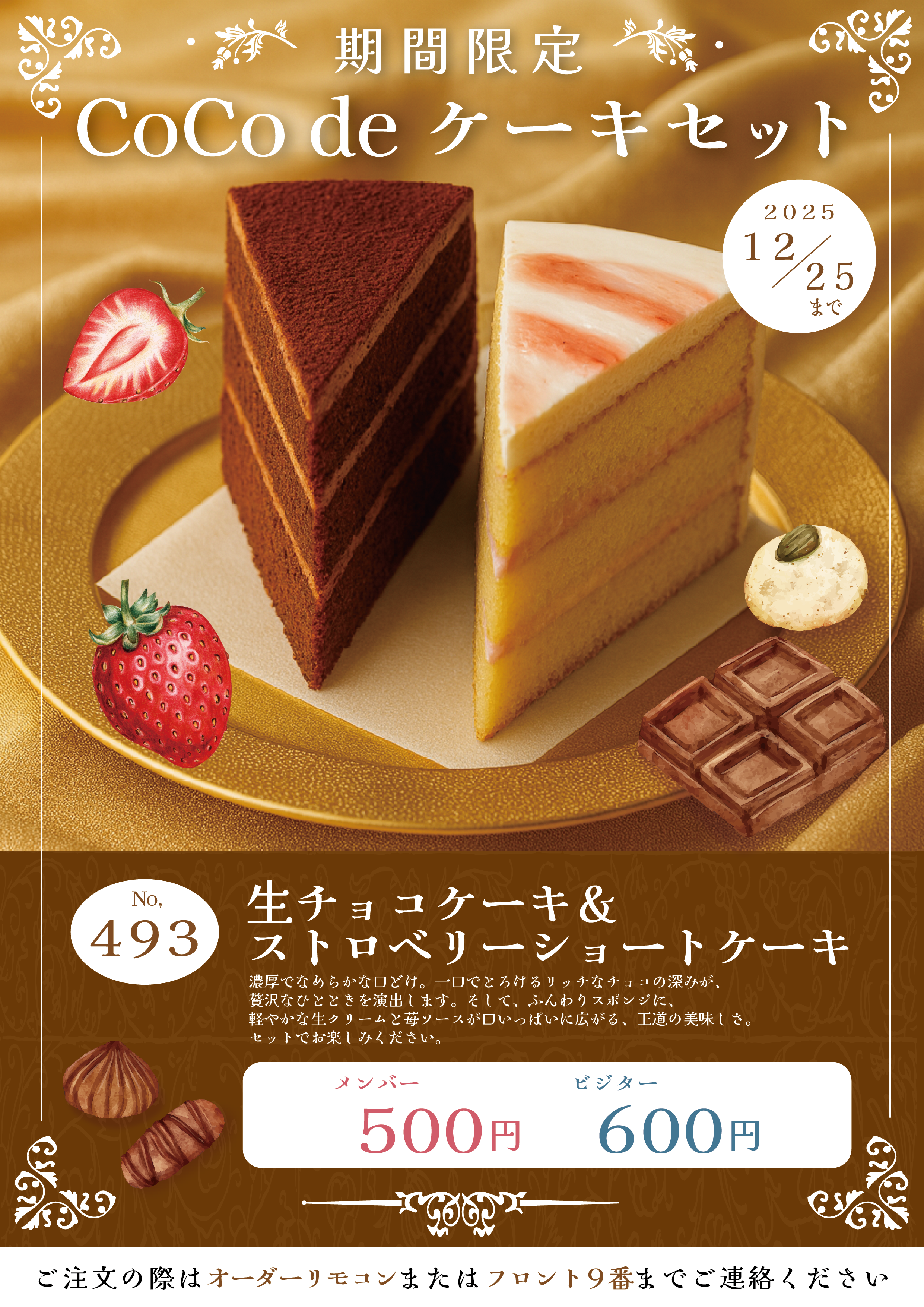 期間限定COCO de ケーキセット ✨✨✨✨✨✨✨✨✨ 🍰期間限定 🍰 CoCo de ケーキセット登場 ✨✨✨✨✨✨✨✨✨ 冬のご褒美スイーツにぴったり💕 人気の「生チョコケーキ」と 「ストロベリーショートケーキ」が セットに🍰 しっとり濃厚なチョコと ふんわり甘い苺のハーモニーが絶品✨ ちょっと贅沢なティータイムを どうぞ☕💝 📅販売期間:12月25日まで🎄 この冬限定のケーキセット🍰 ぜひお早めにご賞味ください💕 ※内容や商品番号は店舗によって異なる場合がございます。オーダーの際は、お部屋に設置されたカタログ・POP等でご確認の上、ご注文ください。 ニュース一覧へ